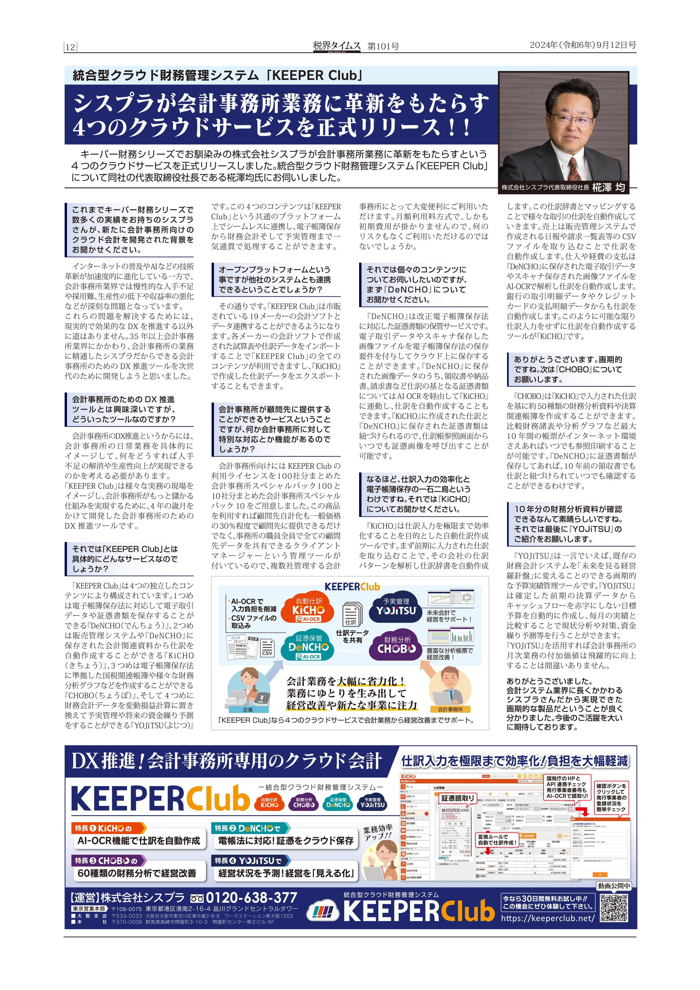 2024年9月9日号掲載 税界タイムス シスプラが会計事務所業務に革新をもたらす 4つのクラウドサービスを正式リリース!!