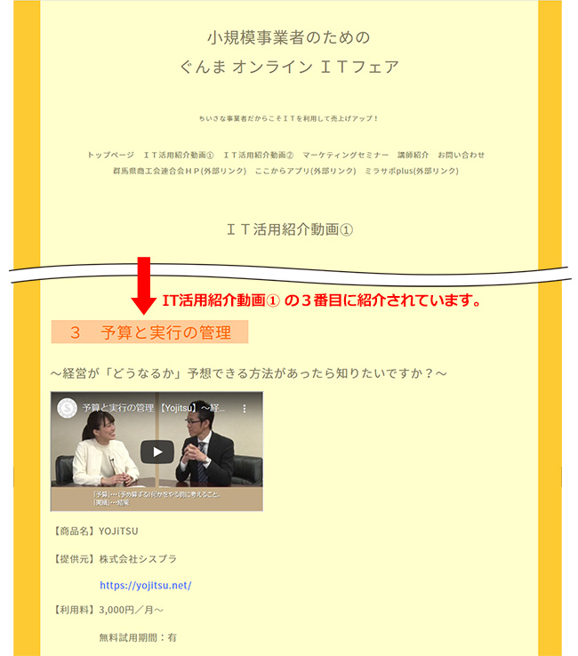 群馬県商工会連合会様より群馬県の事業者に向けITツールを紹介していく「小規模事業者のためのぐんまオンラインITフェア」にて、クラウド予実管理「YOJiTSU」を紹介して頂きました。
